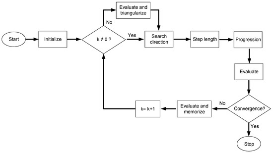 The quasi-Newton method belongs to the class of methods that use derivatives. It is an iterative technique that seeks to find the stationary point where the gradient is zero. For this, it uses the information from the gradient of the evaluation function in each iteration, measuring its changes. It is the intermediate method between the simplicity of the gradient method and the speed of Newton’s method [60]. Figure 2 illustrates the flowchart of the Quasi-Newton method.