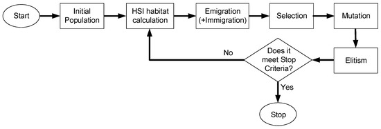Biogeography-based optimization (BBO) belongs to the evolutionary algorithm class and is motivated by the theory of species migration between habitats [62,63]. BBO includes migration-based prospecting and exploration strategies. Through mathematical models of biogeography, it is possible to describe: (i) the evolution of new species (speciation), (ii) the migration of species between islands, and (iii) the extinction of species [64]. BBO algorithm has parameters that must be adjusted to better meet the specificity of each problem to be solved. The initial population is of constant size, generated randomly, and replaced every generation. The immigration probability values define whether a given independent variable of the candidate solution is substituted. The mutation operator must define a probabilistic function that can modify the characteristics of the solution. The desired solution corresponds to the biological habitat suitable for life (high habitat suitability index—HSI). Figure 4 illustrates the flowchart of the BBO method.