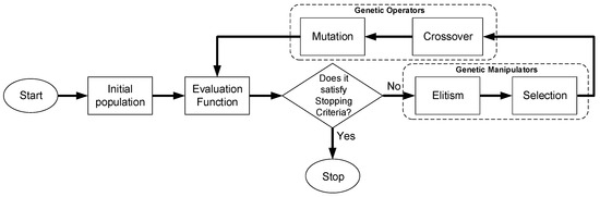 Genetic algorithm (GA) is an evolutionary optimization technique based on a metaphor of the biological process of natural and genetic evolution [65,66]. It is a robust search technique that scans the solution space and finds solutions close to the optimal solution. Its robust nature refers to the ability to perform efficiently on a wide range of problems, not requiring the problem to have particular requirements to be solved. [66]. In classical GA, the population is a matrix of constant size p × g and is initially generated randomly, where p is the number of individuals and g is the number of genes in each individual. Each gene receives the value of a variable of the problem and each individual of the population is a possible solution to the proposed problem and its quality measure is performed through the evaluation function [67]. After being evaluated, the population is submitted to genetic manipulators, elitism, and selection, and then to crossover and mutation operators. Figure 5 illustrates the flowchart of the GA method.