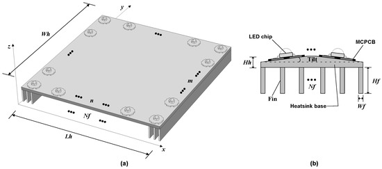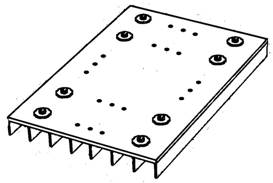 The analyzes are carried out for rectangular luminaires composed of a matrix arrangement of m × n HP-LED fixed on an aluminum dissipative base located on the face opposite the luminous flux output. The variables m and n assume any integer values 1 and do not necessarily have to be equal. For this case, computational and experimental simulation analyses are conducted. The thermal analysis of the luminaire is proposed to verify if the temperature conditions are being met to provide the nominal lifespan of the HP-LED. In the thermal modeling of the luminaire, specific software is used that simulates the heat transfer with the finite element method (FEM). The methodology of thermal analysis and validation of this luminaire is described in Barbosa et al. [46], in which the authors perform the simulation considering the static model in three-dimensional geometry. The simulated three-dimensional model of the HP-LED is illustrated in Figure 6.