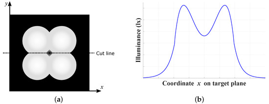 Figure 8. Hypothetical illustration of a luminaire with four LEDs: (a) HP-LED radiation pattern on the target plane and (b) values of illuminance on the cut line on the x axis.