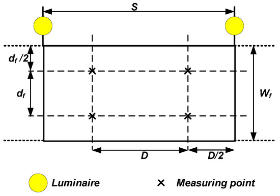 Regarding the illuminance measurement methodology and subsequent uniformity calculation, the standards CIE 140:2000—Road Lighting Calculations and EN 13201:2016—Road Lighting, establish a mesh of points on the target plane. For work environments, it is recommended that the illuminance from 9 to 36 points on a given target plane should be measured. For public lighting for vehicular traffic, a grid is also established consisting of fifteen measuring points per roadway arranged between the two axes of the luminaires. For pedestrian sidewalk lighting, the mesh of points is dependent on the width of the sidewalk.