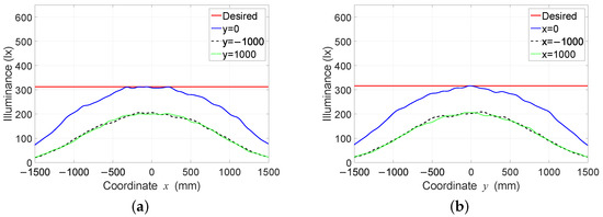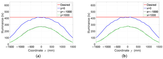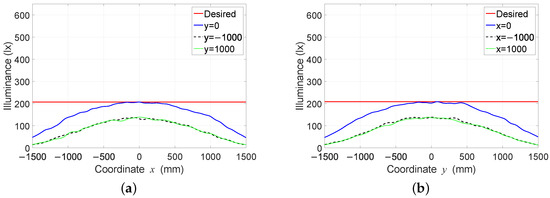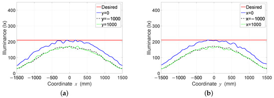 Figure 15. Illuminance distribution curves of the three profiles found using the Nelder-Mead optimization algorithm: (a) on the coordinate axis x and (b) on the coordinate axis y.
