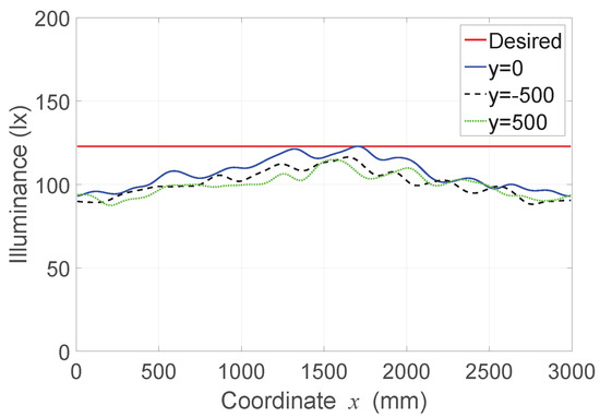 Figure 17. Illuminance distribution curves of the three profiles found using genetic algorithm: (a) on the coordinate axis x and (b) on the coordinate axis y.