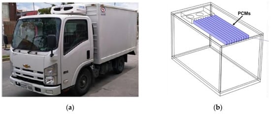 (a) Commercial refrigerated truck; (b) 3D model of the PCM incorporated truck [].