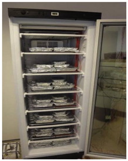 Energy consumption for household cooling as a function of time is significant []. The International Institute of Refrigeration (IIR) estimates that about 4% of the world’s energy is consumed through household cooling and freezing []. In recent years, several researchers have expressed interest in household cooling to improve temperature stabilization (PCM) and maintain temperature during power fluctuations and idling. Figure 5 shows the experimental freezer used in the laboratory [] and Table 6 provides a summary of studies reported with the use of PCM in domestic refrigeration and freezers.