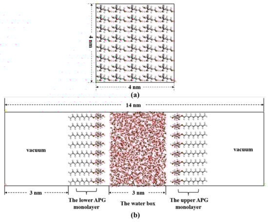 Although the widely used surfactants such as sodium dodecyl sulfate (SDS) and sodium dodecylbenzene sulfonate (SDBS) are effective and inexpensive, they have the disadvantages of poor salt resistance, irritation, and refractory degradation. Whether it is for water or soil, the use of a large number of surfactants has caused pollution. Alkyl glycoside (APG) surfactants have excellent properties such as good performance, non-toxicity, and being harmless and easy to degrade [31], and they are ideal green surfactants. In terms of oil recovery, APG has been used to explore its ability to enhance oil recovery. Additionally, it was found that it has a synergistic effect with alcohol co-solvent, which can generate ultra-low interfacial tension of 0.001 mN/m, which can greatly improve oil recovery [32,33]. Adding APG can also improve the biodegradation rate during bioremediation, and the combination of bioaugmentation and APG is an effective method to remediate petroleum hydrocarbon contaminated soil [34,35]. Studies have shown that the addition of APG is beneficial for improving the activity of hydrolase in waste sludge, which can effectively promote the hydrolysis of pretreated waste sludge, and the effect is also significant in high-concentration brine [36,37]. In addition, the phase behavior of APG [38], the formation of microemulsion [39], and the interaction between APG and other surfactants and additives [40] have been studied. Alkyl glycoside surfactant have been extensively studied in other fields, but their application in foam is very small. The existing applications of APG foam include mine dust control [41], enhanced oil recovery [42,43], and research on APG and other surfactant compound foam systems [44,45]. So far, there are only a few researchers studying APG by molecular dynamics, for example, those studying the wetting and adsorption mechanism of APG on coal [46]. Few or no researchers used molecular dynamics simulations to study the effect of cations on the stability of APG foam.