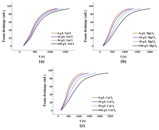 Drainage process of different foam systems. (a) NaCl, (b) MgCl2, and (c) CaCl2.
