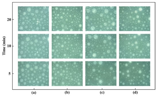 As shown in Figure 3 and Table 1, we captured images of foams containing 50 g/L CaCl2, 50 g/L MgCl2, and 50 g/L NaCl at 5 min, 10 min, and 20 min after foaming through the foam observation device and counted the number of foams in images; their particle size distribution is shown in Figure 4. Particle size distribution during foam coarsening in different systems. (a) 50 g/L CaCl2, (b) 50 g/L MgCl2, (c) 50 g/L NaCl, and (d) APG. In all foam, the number of foams was maintained at a high level at 5 min. Within 5–10 min, the number of foams dropped significantly, and within 10–20 min, the change of the number of foam was relatively small. Considering the 50 g/L CaCl2 foam system as an example, at 5 min, there were 978 foams in the visual field, most of which were relatively small foams. However, at 10 min, the number of bubbles dropped to 389, and at 20 min, the number of bubbles remained at 284, and the number of large bubbles increased. Combining images and statistical data, we found that within 5–10 min, a large number of small foams coarsened into large foams, and within 10–20 min, this phenomenon became less obvious. This is because, in the initial stage, the pressure difference between the relatively large foam and the small foam was large, the gas phase mass transfer rate was fast, and the foam coarsening phenomenon was obvious. With the increase of time, the particle size distribution curve shifted slightly to the right, the number of small bubbles decreased, but the diameter did not change much, and the number and radius of large bubbles gradually increased. The results also show that adding cations were able to slow down the foam coarsening process, and the ability to slow down the coarsening was: Ca2+ > Mg2+ > Na+.