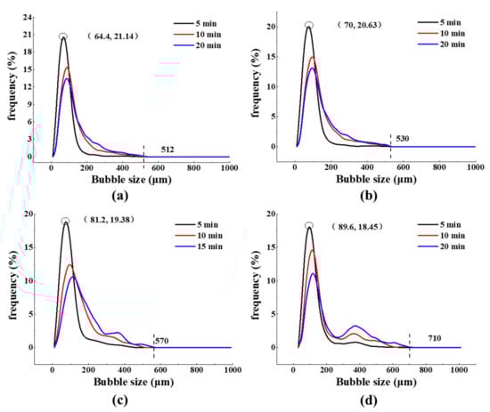 Particle size distribution during foam coarsening in different systems. (a) 50 g/L CaCl2, (b) 50 g/L MgCl2, (c) 50 g/L NaCl, and (d) APG.