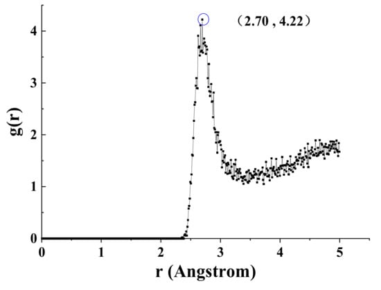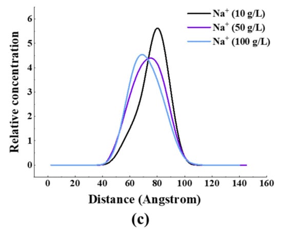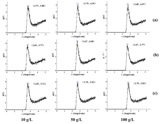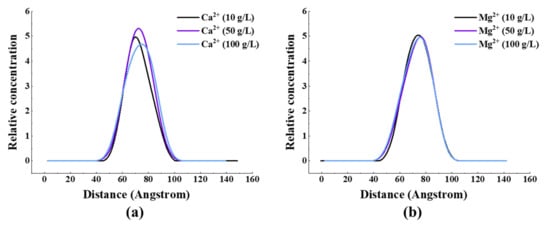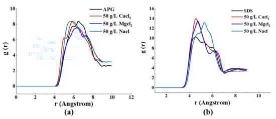 Selecting the APG head groups as the center, the radial distribution of water molecules was analyzed. Figure 10 represents the APG foam without cation, which can be used as a control. The RDF of APG head groups and water molecules in different concentrations of Na+, Ca2+, and Mg2+ foam was obtained, as shown in the Figure 11. We found that with the addition of metal cations, the number of water molecules around the APG head groups decreased. The decrease in the number of water molecules around the head groups varied with different cation species and cation concentrations, but only slightly, up to 11.8%. From Figure 12, in the SDS foam, the addition of cations was able to greatly reduce the peak value of g(r), which was the most obvious in the foam with Ca2+ added where g(r) decreased by 46.5%. The results show that with the increase of cation concentration, the probability of cations appearing around the head groups (APG) was greater, and the position of the cation was getting increasingly closer to the head groups. As shown in Table 2, in the foam with a concentration of 10 g/L NaCl, Na+ did not appear in the hydration layer of the head groups, but when the concentration was 50 g/L and 100 g/L, there was Na+ in the hydration layer. In the system with Ca2+ added, at the concentration of 10 g/L and 50 g/L, there was no Ca2+ in the hydration layer, and when the concentration was 100 g/L, there was Ca2+ in the hydration layer. In the system with Mg2+ added, when the concentration increased to 100 g/L, there was still no Mg2+ in the hydration layer. From this we can see that the ease of the three cations approaching the APG head groups was: Na+ > Ca2+ > Mg2+.