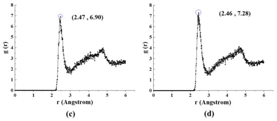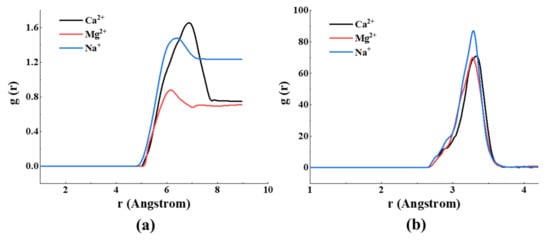 Radial distribution functions of SDS head groups and water molecules in different cationic foam systems. (a) SDS, (b) SDS with 50 g/L CaCl2, (c) SDS with 50 g/L MgCl2, and (d) SDS with 50 g/L NaCl.