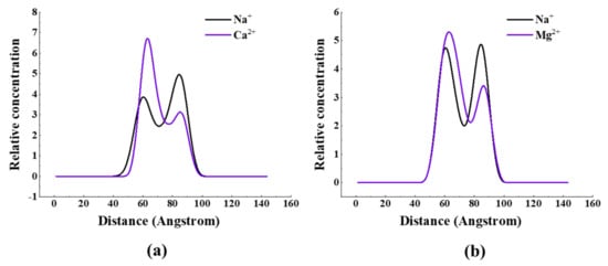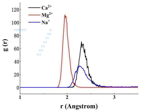 However, in the process of the cations approaching the head groups gradually, the cations in different positions had different influence mechanisms on the hydration layer of the head groups. On the basis of the evidence provided by the simulation experiments, we propose the mechanism of the influence of cations on the hydration layer of the head groups of nonionic surfactants (APG) at the molecular level. In the process of increasing cation concentration, the cation gradually approached the APG head groups. From Figure 11 and Figure 13, we can found that the ability of cations to attract water molecules was stronger than that of nonionic surfactant head groups; when the overlapping area of the hydration layer of the cation and the hydration layer of the head groups was small, the cation and the headgroups competed for adsorption, reducing the amount of water molecules around the headgroups. Considering Mg2+ as an example, when the concentration was 10 g/L, Mg2+ at a distance of 4.48 angstroms from the headgroups attracted water molecules to form a hydration layer of Mg2+, in the range of approximately 2 angstroms. This range affected the hydration layer of the head groups. This means that Mg2+ competes with the headgroups to adsorb water molecules, so that the ability of the APG head groups to bind water molecules became weaker, and the peak of g(r) decreased. As cations continued to approach the head groups, the overlapping area of the two hydration layers was larger. The strong attraction of cations to water molecules increased the density of water molecules around the head groups, resulting in an increase in the peak of g(r). However, when the concentration increased to a certain value, the cations entered the hydration layer of the head groups and replaced the original position of water molecules, so that the density of water molecules around the head groups gradually decreased, and the peak value of g(r) decreased.