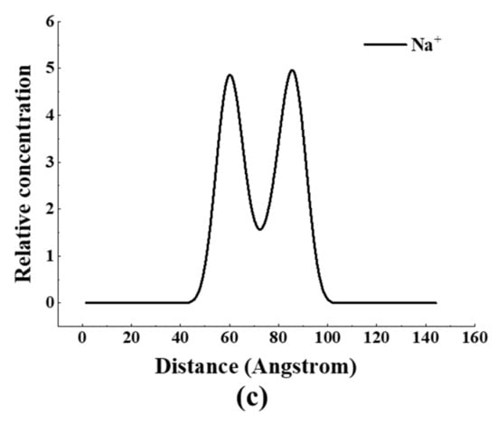 First, water molecules and anions and cations, APG [46] and SDS surfactant molecules, were established, and then the foam film structure was constructed. The foam film model is shown in Figure 1. On the z-axis in three-dimensional space, the foam film consists of three layers of molecules. The first and third layers are surfactant molecules, and the water layer is in the middle. In the process of establishing the brine layer, the number of anions and cations in the box was calculated based on the true density of the brine. A vacuum layer of 30 Å was applied on each side of the film to avoid the effect of the periodic boundary on the surfactant molecules. Before molecular dynamics simulation, geometric optimization was carried out to cause the system reach a relatively stable state. In the molecular dynamic simulation process, we first calculated 600 ps and output 1 frame every 1 ps. Then, we calculated 300 ps and output 1 frame every 1 ps. During this process, the system was basically in a balanced state. During the simulation process, enough trajectory files were output to ensure the accuracy of statistical analysis.