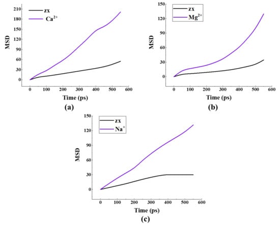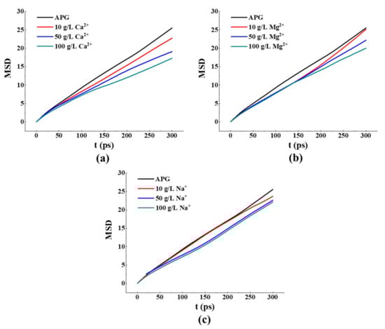 We found that in the APG foam with cations, there were two factors that mainly affected the stability and drainage of the foam: one was the number of water molecules in the hydration layer of surfactant head groups, and the other was the diffusivity of water molecules in the hydration layer. Two factors together determined the water retention capacity of the foam. The harder it was for the water molecules to diffuse, indicating that the foam film was in a more stable state, the slower the drainage, and the less likely the foam was to break. From the previous analysis, we know that the number of water molecules in the head groups hydration layer of APG is in a relatively stable state, and the type and concentration of cations have little effect on it. Therefore, we calculated the MSD of water molecules in the head groups hydration layer of different systems to evaluate the ease of diffusion of water molecules in the hydration layer. The results are shown in Figure 14. The results show that the water molecules in the hydration layer of head groups were more difficult to lose after the addition of cations, and the water molecules in the hydration layer of headgroups in the divalent cationic foam were more difficult to diffuse. In the foam system containing three different salts, the water retention capacity of the foam was: Ca2+ > Mg2+ > Na+. Combined with the experimental situation, we can see that in the foam with cations added, the cations were dispersed near or in the hydration layer of the head groups. Due to the strong attraction of cations to water molecules, the diffusion coefficient of water molecules in the hydration layer of head groups was reduced. This enhanced the water retention capacity of the foam and reduced the rate of foam drainage, and this trend increased with increasing concentrations.