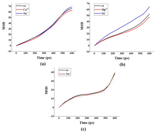 MSD of surfactant head groups and cations surrounding the head groups in different SDS foams. (a) 50 g/L CaCl2, (b) 50 g/L MgCl2, and (c) 50 g/L NaCl.