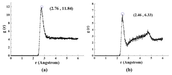 In previous studies, it was found that the arrangement behavior of the head groups and the tail groups also affects the stability of the foam. We defined the centroid (zx) of the APG head groups and used the g(r) of zx and zx to study the clustering of the head groups. The larger peak value of g(r), the smaller the distance corresponding to the peak value, the more obvious the phenomenon of head groups aggregation. Aggregation of the head groups can disrupt the monolayer structure of the surfactant, making the foam prone to voids and collapse [15]. The effect of different cations on the degree of head groups aggregation is shown in Figure 15 and Table 3. It was found that in the APG foam, the peak value and position of the first peak of RDF did not change much, indicating that the addition of cations would not cause serious aggregation of the head groups. However, in the foam formed by the nonionic surfactant SDS, the addition of salt ions caused obvious head groups aggregation, and Ca2+ was the most likely to cause this phenomenon. In the system without cations, the peak of g(r) was 10.4, the peak of g(r) was 13.2 after the addition of Na+, the peak of g(r) was 13.5 after the addition of Mg2+, and the peak of g(r) was 14.0 after the addition of Ca2+.
