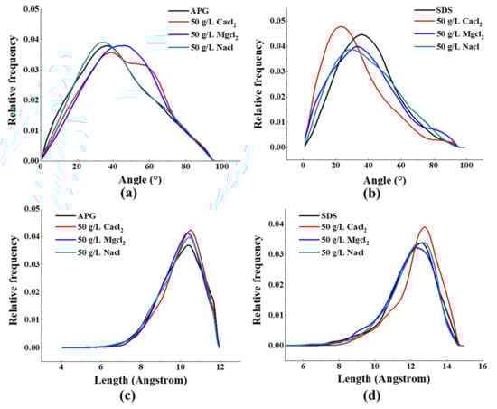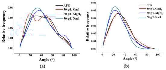 Figure 18 shows the statistical results of θtail and Ltail in different foam. For APG foam, Na+ had little effect on the θtail, Mg2+ and Ca2+ made the θtail larger, and the Ltail increased. In general, the addition of cations reduced the angle between the tail groups and the liquid phase and allowed the tail groups to expand. In this way, a more sufficient staggered arrangement was achieved between the tail chains, which allowed the foam have better viscoelasticity and increased the stability of the foam. For the SDS foam system, the cation increased the interface angle between the tail groups and the liquid phase, and only Ca2+ made the tail chain longer; Na+ and Mg2+ had little effect on the Ltail. However, the decrease of θtail and the increase of Ltail greatly reduced the probability of cross-arrangement of tail groups, which is the one of main reason why Ca2+ greatly reduced the stability of SDS foam.