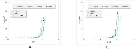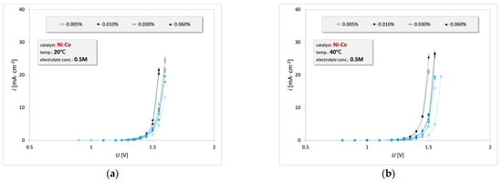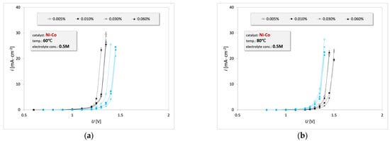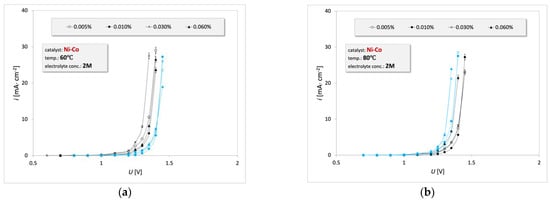 3.1. Electrooxidation of Waste Engine Oil Emulsion on the Ni-Co Catalyst