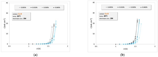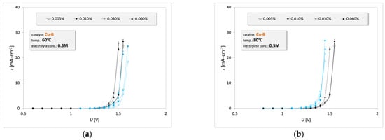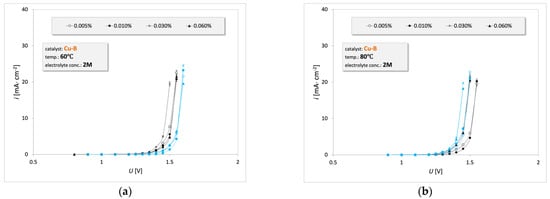 3.2. Electrooxidation of Waste Oil Emulsion on the Cu-B Catalyst