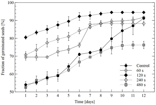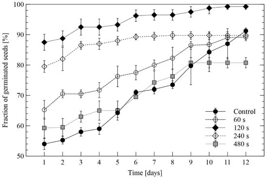 Seed pre-treatment with low-temperature atmospheric-pressure plasma generated using a GlidArc reactor proved to be suitable for improving the germination of Thuringian Mallow (Lavatera thuringiaca L.). The best seed germination parameters were observed for plasma exposure times of 2 and 5 min [28]. Furthermore, 1 min cold atmospheric plasma (CAP) treatment of chickpea seeds (Cicer arietinum L.) produced an increased seed germination rate and germination speed, as well as better seed vigor. Additionally, a decrease in the mean germination time compared to control was observed [29].