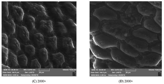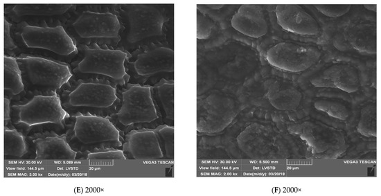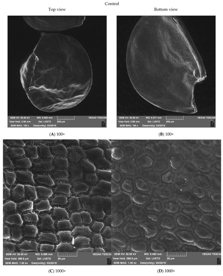 Figure 4 shows exemplary SEM images of the surface of the onion seeds. The seeds possess an irregular, pyramidoid shape where one can distinguish the distinct foundation and slopes. The maximal linear size of the seeds varies between 2 and 3 mm, and some of them are more flat or more protuberated. SEM scans were made to visualize both the slopes (top view, Figure 4A) and the foundation (bottom view, Figure 4B). It is difficult to define the seeds’ cell epidermal structure pattern [54]. Cells have an elliptical- or circular-angular shape and are rather flat (Figure 4C,D). Concerning the differences between the top and bottom cells, the latter differ with the degree of the coverage of the cuticle with wax (Figure 4C,E vs. Figure 4D,F).