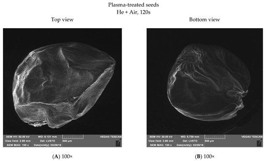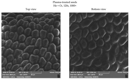 Slight changes in the microstructure of the seeds’ surface after plasma treatment were visible during SEM analysis: the cuticle layer with wax was subtly thinned and the level of corrugation increased.