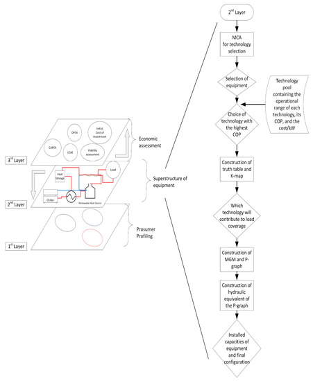 The proposed methodology for layer 2 is a novel way of eliminating the a priori requirement of complex energy systems design. The introduction of appropriate technologies’ selection via AHP method significantly reduces unfeasible solutions and the complexity of the design. As a next step, the authors suggest a Karnaugh map approach which optimizes the design process via exploring several combinations of the selected equipment and how they will interact to meet the heating and cooling loads. Following that step, the design of P-graph and Maximal Generation matrices exploit the information of the Karnaugh map and present a first superstructure approach for the system. To conclude the second layer, the authors investigated the application of logic circuits in hydraulic systems, and they presented a complete mechanical design solution for both heating and cooling scenarios using the case study of Kimmeria, Xanthi. The proposition of a final hydraulic system layout for the superstructure is novel and such an approach is not yet mentioned in the literature available, to the best knowledge of the authors.