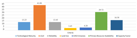 Table 1 summarizes the application of the AHP method for the selected sub-criteria. The values in Table 1 are the product of an extensive literature review of the most case-specific research work. As an example, in the initial step of AHP table filling, the LCoE’s correlation was 6 to 7 times more important to the Technological Maturity sub-criteria in the existing literature [24]. Therefore, the authors’ choice assumption was the worst-case scenario of 7. Figure 2 indicates the weighted sums of the factors considered in the AHP, which significantly contribute to the sub-criteria hierarchy. The results of the hierarchical method indicate that the LCoE and Primary Resource Availability are the most important sub-criteria. The Capacity Factor and Technological Maturity are also included in the important sub-criteria based on the background works [10,11,23,25,26]. The Random Index (R.I.) used for the 7 criteria in the AHP method is 1.32 and the coefficient 6.17.