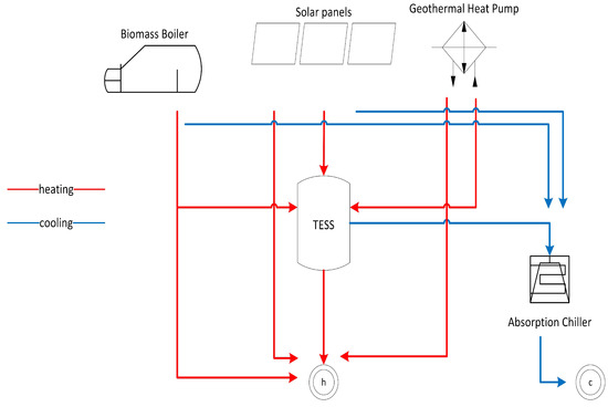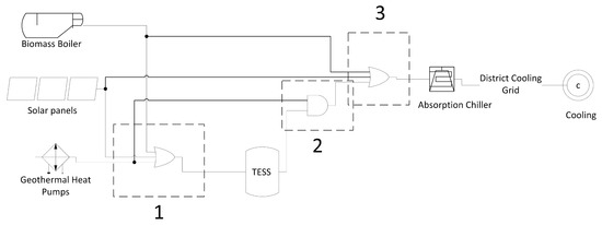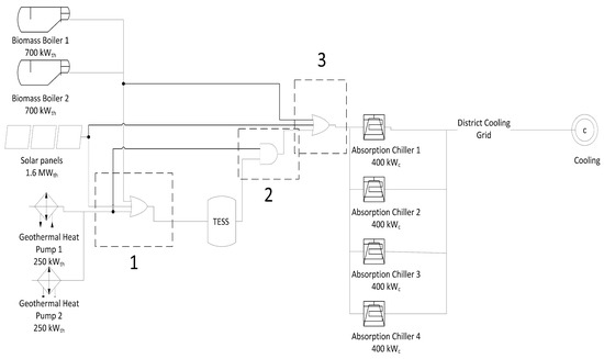 The results of Equations (1) and (2) is the MGM as depicted in Figure 3. The thermal energy production assets (Biomass Boiler, Solar panels and Geothermal Heat Pumps) are all contributing to the thermal load, either via the charging of the TESS, or by covering it directly. These thermal loads might be the heating load or the thermal energy required for the production of the cooling energy by the absorption chiller.