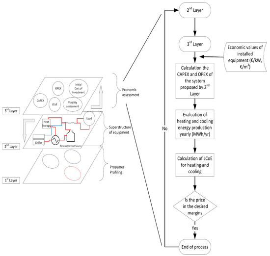 The proposed system’s aim is to cover the heating and cooling needs of a Thermal Local Energy Community (TLEC). In order to assess its viability, several Key Performance Indicators (KPIs) are incorporated. The procedure of assessing the viability and economic feasibility of the proposed superstructure is depicted in Figure 5. After the construction of the final layout of the system, the designer may continue with the economic assessment of the proposed system. In order to proceed, the first step of the 3rd layer is to calculate the CAPEX and OPEX of the system according to up-to-date market values. For the next step, the calculation of the produced thermal and cooling energy may be performed, so that the LCoE of the system can be adequately assessed. If there are any limitations on budget (CAPEX) or on the cost of energy (LCoE), the designer may decide to return to the 2nd layer, and differentiate the installed capacity of any of the chosen equipment.