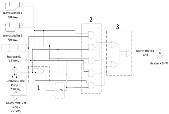 The proposed methodology focuses on two aspects of DTESS design: the selection of the appropriate technology based on criteria weighting and the construction of the system to address the needs of the TLEC. The first stage was approached via an AHP method, based on well-established research works, while the second one introduces a novel method of designing hydraulic thermal energy systems using logic gates for the construction of a P-graph (see Figure 1). The first novelty of the method lies on the elimination of a priori step from the side of the designer, which is one of the fundamental issues of complex systems design [20]. The second novelty is the proposition of a final superstructure layout. By proposing a layout, modifications, control strategies and installation decisions on case-specific aspects can be made.