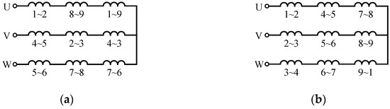 - Ismail, K.S. A New Graphical Approach to Three Phase Two Speed Induction Motor Winding Design. IEEE Trans. Energy Convers. 1998, 13, 334–346. [Google Scholar] [CrossRef]