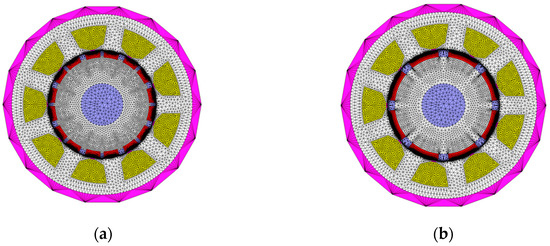 - Ghoroghchian, F.; Aliabad, A.D.; Amiri, E. Two-speed Line Start Permanent Magnet Synchronous Motor with Dual Magnetic Polarity. IEEE Trans. Ind. Appl. 2018, 54, 4268–4277. [Google Scholar] [CrossRef]