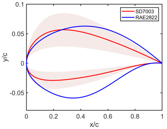 For example, suppose the design baseline is an SD7003 airfoil and a 50% perturbation is performed on the baseline values, and the design target is a supercritical airfoil, such as RAE2822, which requires a flat upper surface and a bent lower surface to compensate for the lift loss caused by the nose’s low curvature. Figure 2 shows that the majority of RAE2822 lies outside of the design space, in the blush region.