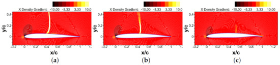 The gradient of density along the streamwise direction on the SD7003 airfoil: (a) baseline; (b) CST; and (c) Grassmannian.