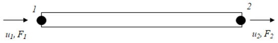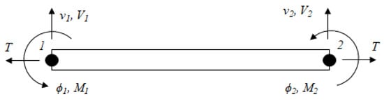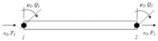 In the analysis each node has two degrees of freedom, with longitudinal u and transversal displacements, where , represents the transverse contraction [32]. The two nodes Mindlin-Hermann rod element is presented in Figure 3.