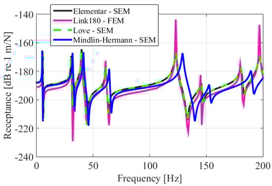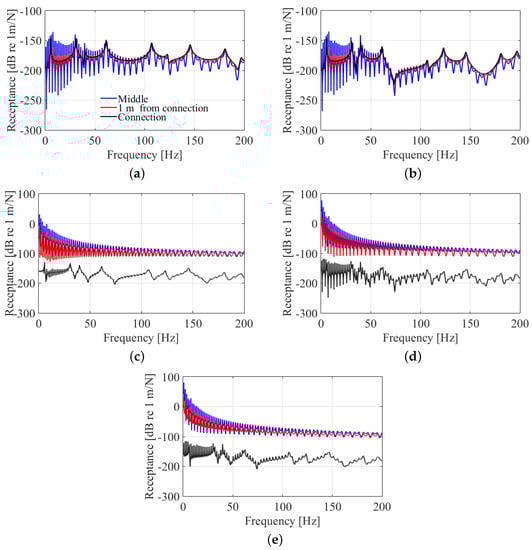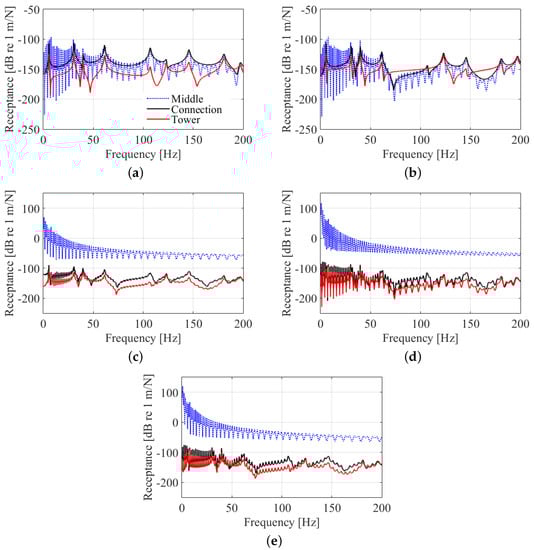 The influence of the excitation position is presented in Figure 16. It assumed a unitary force imposed at the coupling point ’b’ (black curves), a meter from the connection in ’c’ (red curves), and at the cable middle length in ’d’ (blue curves). The receptances shown in Figure 16a–e were calculated in the tower, coupling point, in the cable at 1 m and 50 m, and at the end of the cable. The receptances obtained due to the excitation at point ’b’ held a significant influence from the tower in all cases. In contrast, the receptance derived due to the excitation at point ’b’ presented a notable influence of the cable responses and high modal density. However, the tower dynamics modulated the curves. By excitation the system in the middle of the cable, the receptances demonstrated a greater influence of the cable with greater amplitudes in its responses. Therefore, to minimize the influence of tower vibration on the cable response, it is recommended to select the excitation and measurement points over a meter of the connection.