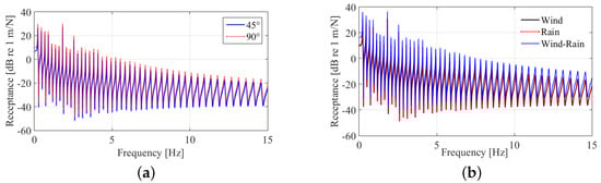 Figure 12a presents the receptance function of the cable exposed to the wind-rain load acting at 45 and 90 angle. Figure 12b shows the results from analysis of the cable that is excited by the wind, rain, and wind-rain as the punctual forces. The basic wind speed was assumed as 20 m/s, corresponding to the category of land as urban areas and lands with many tall trees.