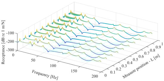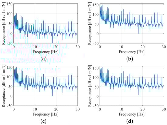 The cable dynamic response changed with the distributed load. Figure 13a–d shows the receptance FRFs of the cable subjected to a tensile load of 27 KN, excited by (a) distributed unitary load; (b) distributed wind excitation with a base speed of 20 ms; (c) distributed rain load with an intensity of 150 mm/h, and (d) distributed wind and rain. The analysis estimated the receptance over a meter of cable from the support and considered distributed load according to the formulation presented in Section 3.