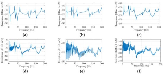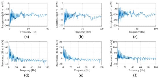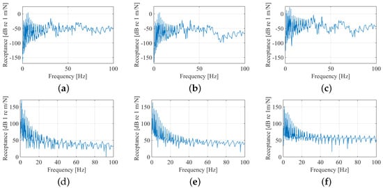 The overhead transmission line composes of a tower coupled to the cable as shown in Figure 5. The FRFs of the system were obtained at the points ’a’ to d due to a unitary excitation force imposed at point ’a’ (red dot). Figure 14a–c are the FRFs measured at the point ’a’ (red dot) horizontal and vertical direction in the tower and b (yellow dot) the coupling point, respectively. The receptance response of those three measurements captured only the tower dynamic resonance frequencies and modes, even in the coupling point where there is the cable attached. The FRF obtained on the cable from a meter of the coupling point is presented in Figure 14d, the interaction of the cable and the tower is observed, and noticed the dynamic behavior of the tower modulates the cable’s response. FRF calculated at the cable middle length, and the end-span are shown in Figure 14e,f, where the cable dynamics increased, but are still modulated by the tower vibration. For the analyzed problem, the range of frequencies from 0 to 200 Hz is significant.