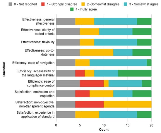 Within the usability category, the criteria related to effectiveness, efficiency, and satisfaction were qualitatively assessed by the authors using a four-point evaluation scale (fully agree–somewhat agree–somewhat disagree–strongly disagree). Please note that neither the previously addressed selection process of the standards nor the rather qualitative setup of the questions regarding the standards’ usability was meant to represent an exhaustive endeavor. However, the collective of the co-authors involved in the assessment can in fact be argued to possess the expertise-related credentials to provide a preliminary qualitative assessment of the selected standards. This process admittedly entails a subjective component. Nonetheless, an effort was made to increase the consistency of the assessment by structured consideration of several salient aspects as applicable to each of the usability criteria. These aspects can be briefly summarized as follows: