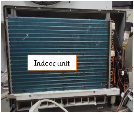 The SC-EVIHP system was composed of two parts: a solar air collector and an EVI-ASHP system. The EVI-ASHP system included outdoor and indoor units. The outdoor unit included a compressor, four-way reversing valve, outdoor heat exchanger, electronic expansion valve, and other equipment components. The indoor unit included an indoor heat exchanger and control system. The system principle and equipment pictures are shown in Figure 1, Figure 2 and Figure 3. The total area of the solar energy collector was 10.5 m2, and the collector efficiency was more than 55%. The fan airflow was 570 m3/h. The refrigerant of the EVI-ASHP system was R32, with a rated heating capacity of 4000 W and a rated power of 1700 W. The EVI compressor used a fully enclosed DC inverter. Both the indoor and outdoor units of the EVI-ASHP system used fin heat exchangers.