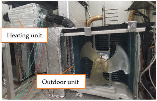 In Formula (2), is the heating capacity of the heat pump (kW). is the compressor power (kW), which is measured by a three-phase power meter. is the heater fan power (kW), which is a CY125 (Shenzhen Xin Hao Long Electronic Technology Co., Ltd, Shenzhen, China) centrifugal fan with a power rating of 108 W.