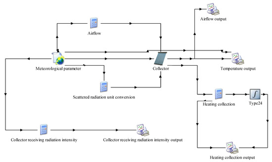 The experiment was carried out in an enthalpy difference laboratory, meeting the requirements of relevant national standards. In order to simplify the experiment and operate it easily, TRNSYS software was used to simulate the solar air collector, as shown in Figure 4. Through the software simulation, the outdoor air heated by the solar air collector could be measured. The same effect could be achieved by using the heating device to provide hot air to the same temperature. Eight groups of measuring points were set up on the system to measure the pressure and temperature at each point. The system was equipped with a mass flow meter, a power meter, a hydraulic mirror, a filter drier, and other equipment. The specific experimental equipment parameters are shown in Table 1. An Agilent 34,972 A (Keysight Technologies, Silicon, CA, USA) Valley was used for data collection at an interval of 5 s.