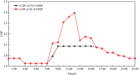 Figure 7 and Figure 8 show the comparison between the heating capacity and COP of the system. As can be seen from the figures, when the solar radiation intensity was 0, the heating capacity and COP of the two systems were the same. During 7:00~16:00, the solar radiation intensity increased first and then decreased to 0. Because the conventional EVI-ASHP system has no solar air collector, system performance was mainly affected by the outdoor temperature. At this point, the heating capacity and COP were low. For the SC-EVIHP system, the hot-air temperature at the solar air collector outlet increased rapidly with the increase in solar radiation intensity. The evaporation temperature of the SC-EVIHP system increased. This made the suction gas capacity of the compressor smaller and the mass flow of the heat pump moving fluid larger, thus causing an increase in the heating capacity and COP of the system. During this period, the heating capacity increased by 2.3~24.9%, with an average increase of 9.2%. The COP increased by 0.59~12.53%, with an average increase of 5.6%. At 12:00, the solar radiation intensity was the highest. The heating capacity and COP of the SC-EVIHP system also reached their peak. At this point, the heating capacity was 4.16 kW and the COP was 2.35. Compared with the EVI-ASHP system, the heating capacity and COP were increased by 24.9% and 12.5%, respectively. According to the experimental data, compared with the single EVI-ASHP system, the SC-EVIHP system had a better heating effect and more energy conservation. From 12:00 to 13:00, due to the sudden decrease in solar radiation intensity, the heating capacity and COP of the SC-EVIHP system also decreased. This indicates that the SC-EVIHP system is greatly affected by solar radiation intensity.