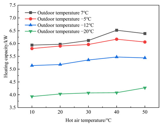 The comparable results of the heating capacity of the SC-EVIHP system under different outdoor temperatures and different hot air temperatures are displayed in Figure 9. As shown in Figure 9, when the outdoor temperature was −12 °C, −5 °C, and 7 °C, respectively, the heating capacity increased first and then decreased with the increase in hot air temperature. When the hot air temperature was 40 °C, the heating capacity reached the maximum value, then it decreased with the rising hot air temperature. The reason for this is that with the increase in hot air temperature, the evaporation temperature of the system rose gradually, and more refrigerant absorbed heat from the outside to evaporate for circulation, thus the heating capacity of the system increased. However, as the hot air temperature continued to rise, more refrigerant entered the compressor through the vapor injection loop, causing a decrease in exhaust temperature and the temperature of the condenser inlet. These results caused a decrease in the heat transfer temperature difference between the system and the external environment. Although the mass flow in the system was improved, the heat transfer temperature difference plays a dominant role in the heat transfer process, so the heating capacity decreased. When the outdoor temperature was −20 °C, the heating capacity gradually increased with the rising hot air temperature. The heating capacity can be kept at about 4 kW. This indicates that a good heating condition can still be achieved in a cold area. As can be seen from Figure 9, as the outdoor ambient temperature decreased, the heating capacity of the SC-EVIHP system had greater improvement [22,23].