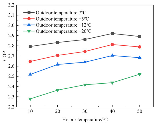 Comparison of the COP of the SC-EVIHP system at different outdoor temperatures and different hot air temperatures is shown in Figure 10. The variation trend of the COP was similar to that of the heating capacity. When the outdoor temperature was −12 °C, −5 °C, and 7 °C, respectively, the COP increased first and then decreased with the increase in hot air temperature. When the hot air temperature was 40 °C, the COP reached the maximum value, then it decreased with the rising hot air temperature. The reason is that with the increase in hot air temperature, the evaporation temperature of the system rose gradually, thus causing the heating capacity of the system to increase. However, as the hot air temperature continued to rise, the heating capacity of the system decreased. Moreover, as more refrigerant entered circulation, the power consumption of the compressor also increased. This resulted in a decrease in COP. When the outdoor temperature was −20 °C, the COP gradually increased with the increasing hot air temperature. This indicates that the SC-EVIHP system operates more stably in cold regions.