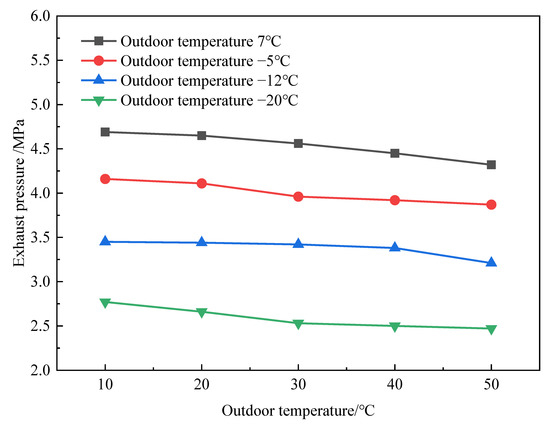 The comparison of compressor exhaust pressure of the SC-EVIHP system at different outdoor temperatures and different hot air temperatures is shown in Figure 11. The compressor exhaust pressure was greatly affected by the outdoor temperature. The exhaust pressure increased with the increasing outdoor temperature. When the outdoor temperature was unchanged, the exhaust pressure gradually decreased by 7.5 to 12.1% as the hot air temperature increased. When the outdoor temperature was −20 °C, the decrease range was the largest. This indicates that the SC-EVIHP system has its best operational performance in a low-temperature environment.