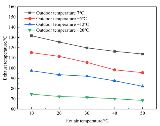 Figure 12 shows the comparison of compressor exhaust temperatures of the SC-EVIHP system at different outdoor temperatures and different hot air temperatures. Compressor exhaust temperature is mainly affected by two parameters: suction temperature and compression ratio. As the outdoor temperature increased, the evaporation temperature increased, causing the compressor suction temperature to rise and the compression ratio to decrease. At this time, the suction temperature plays a leading role in causing the rise of the compressor exhaust temperature. As shown in Figure 12, when the outdoor temperature was 7 °C, the compressor exhaust temperature was 131 °C. High compressor exhaust temperature causes carbonization of the lubricating oil. It will increase the wear of the compressor’s moving parts, thus affecting the service life of the compressor. As the hot airflow increased, more refrigerant entered the compressor from the vapor injection loop. The compressor exhaust temperature was effectively decreased by 9~21%. This shows that the SC-EVIHP system is safer and more stable than the EVI-ASHP system.
